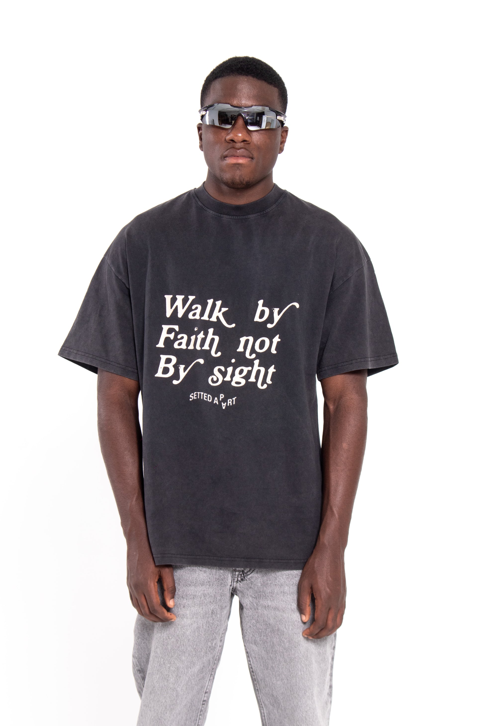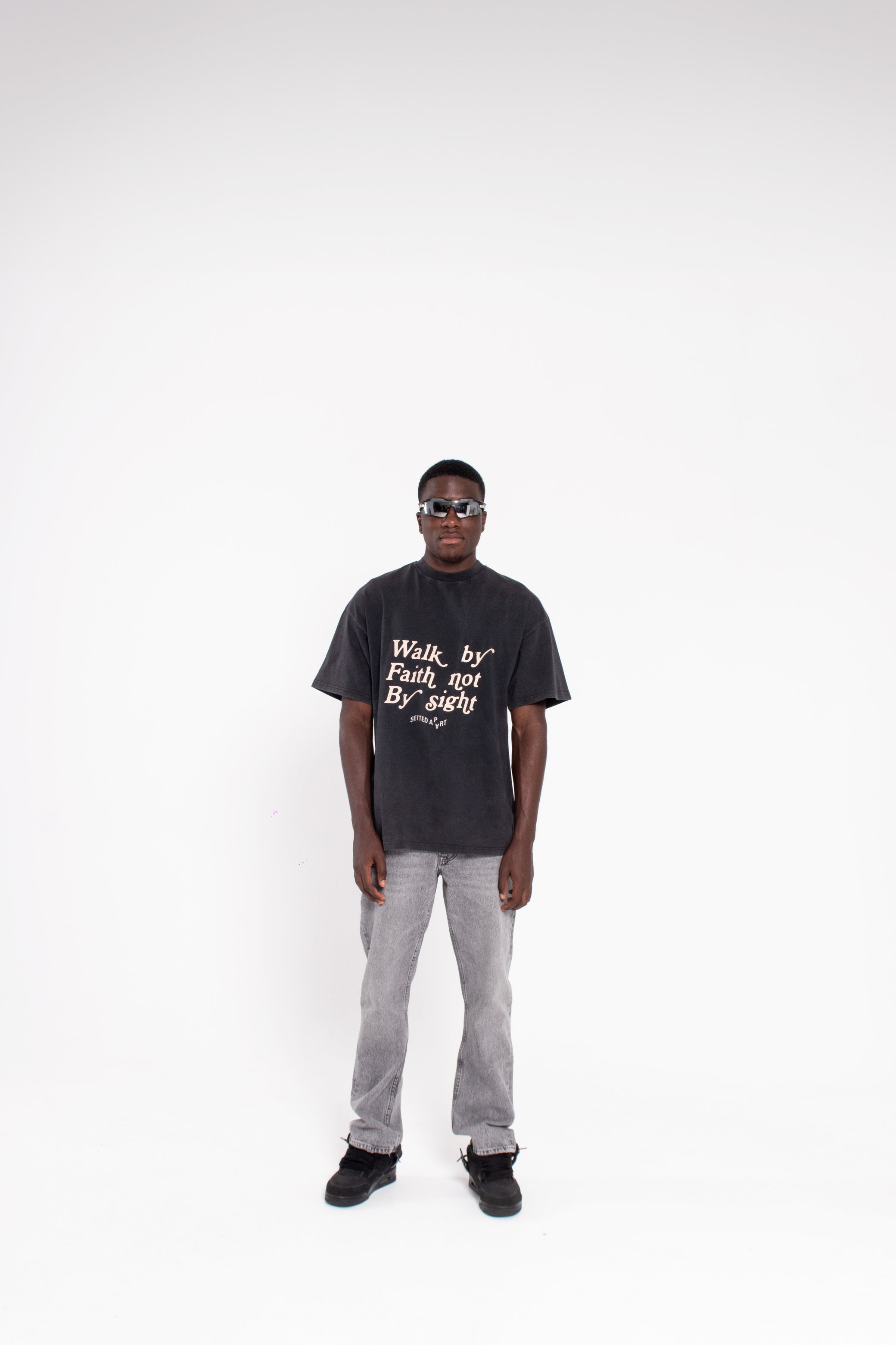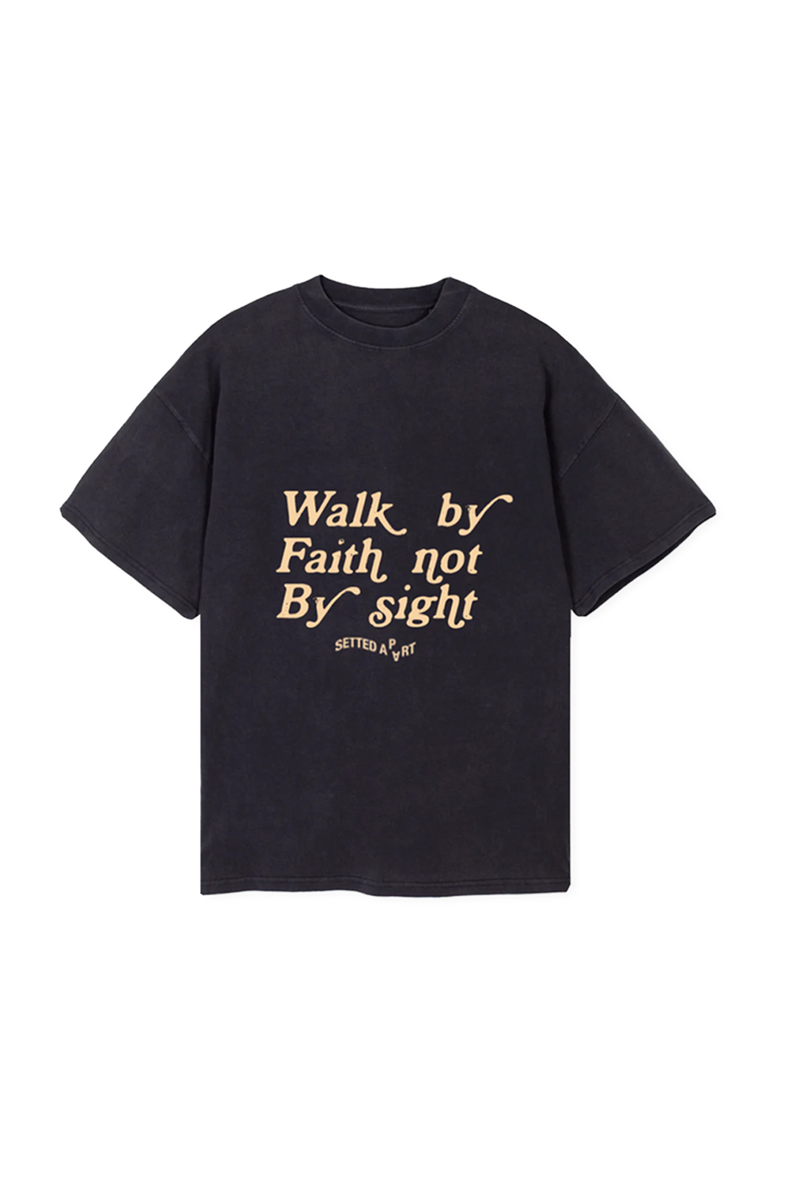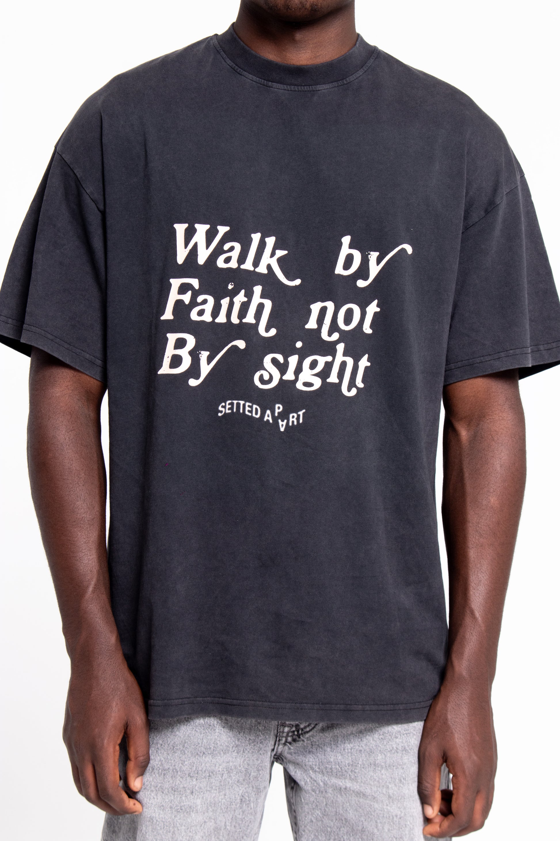 Black t-shirt featuring Walking in faith not by sight stamp. Crewneck collar.